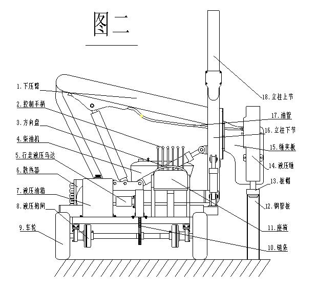 本机主要由底盘,上框架、下压臂、液压锤、发动机、散热器液压系统及电器系统等部分组成。立柱与上框架采用万向铰接,立柱的垂直调节和纵横移动,均采用液压控制,调整方便,液压锤安装在下压臂前端,操纵台上安装有组合多路阀,液压系统集中控制,操作简单,容易掌握。