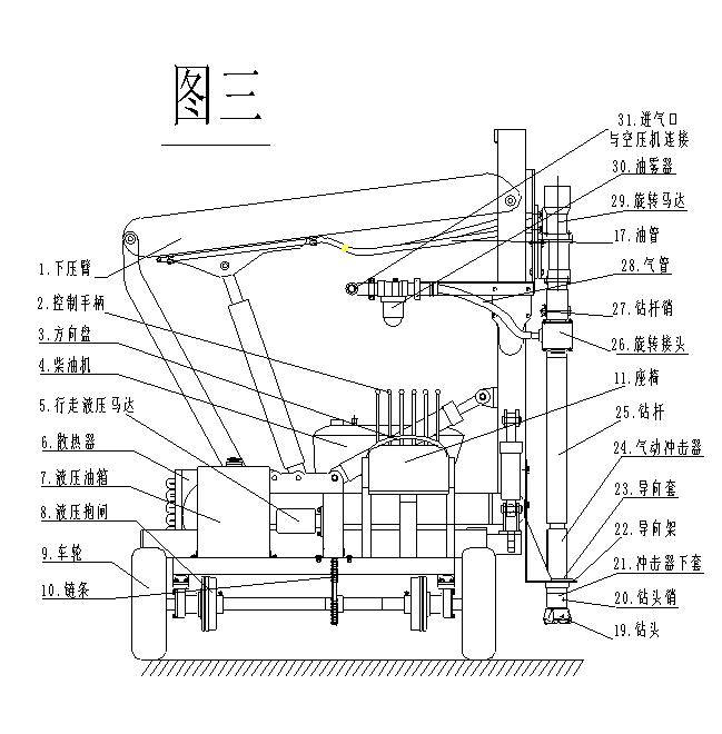 (1)把液压锤进出油管从液压锤上卸下,松开液压锤夹板连接螺栓把液压锤和锤夹板一同从打桩机上卸下,装上钻机支架,连接液压油管,装上气动冲击器和钻头,接上压缩空气通气胶管,钻孔时可把空气压缩机连接在本打桩机后的挂板上,用打桩机的动力拖着空压机行走。
